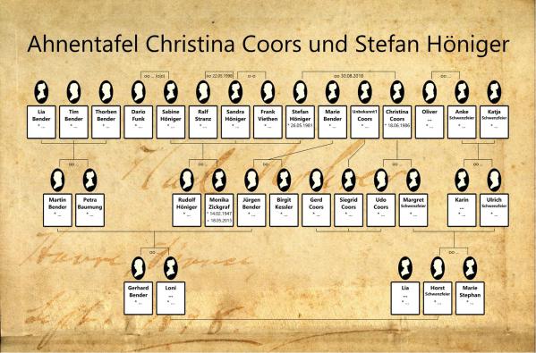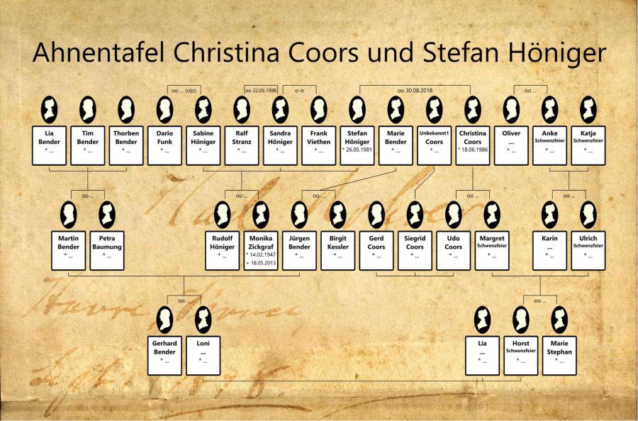 Diese Ahnentafel ist nicht vollständig, es gib jedoch die Möglichkeit, wenn jemand was ergänzen kann mir eine E-Mail zu senden ich werde die Informationen entsprechend einpflegen und hier aktualisieren.